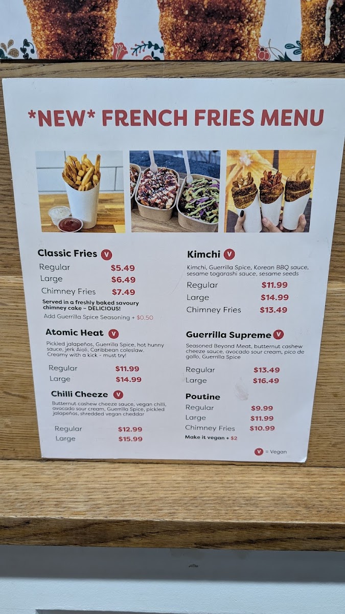 ................................CA$11.99Fries, Kimchi, Guerrilla Spice, Koren BBQ Sauce, Sesame Togarashi Sauce, Sesame Seeds