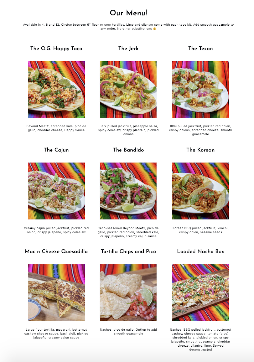 ................................CA$22.493 x 6" tortillas, taco-seasoned Beyond Meat, shredded kale, pico de gallo, cheddar cheeze, Happy Sauce